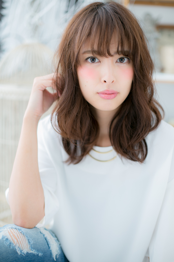 Aラインシルエットで小顔に見せたくせ毛風カールのふわミディ。暗髪の重めスタイルでも、透け感ある斜めバングで空気感と軽さを出して重軽MIXに。前下がりや耳かけも大人かわいい♪(メイク担当:COVER HAIR GROUP 棟方)