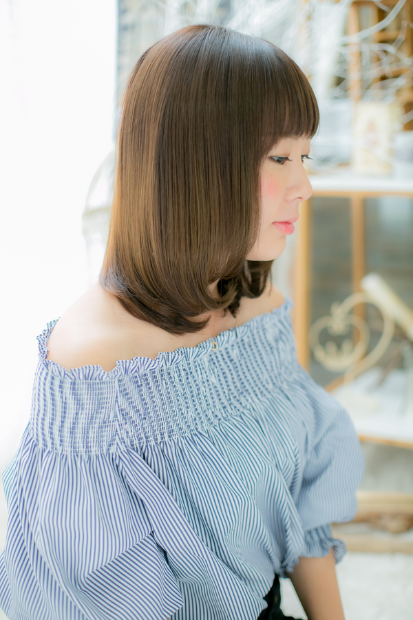 前下がりラインで輪郭カバーして小顔に。前下がりボブやフェミニンボブ、大人ボブやナチュラルボブからの伸ばしかけにオススメ。センターパートやアシンメトリーで大人っぽく、クラシカルな黒髪やグレージュもGOOD☆ヒアルロン酸カラーは白髪にも対応可。