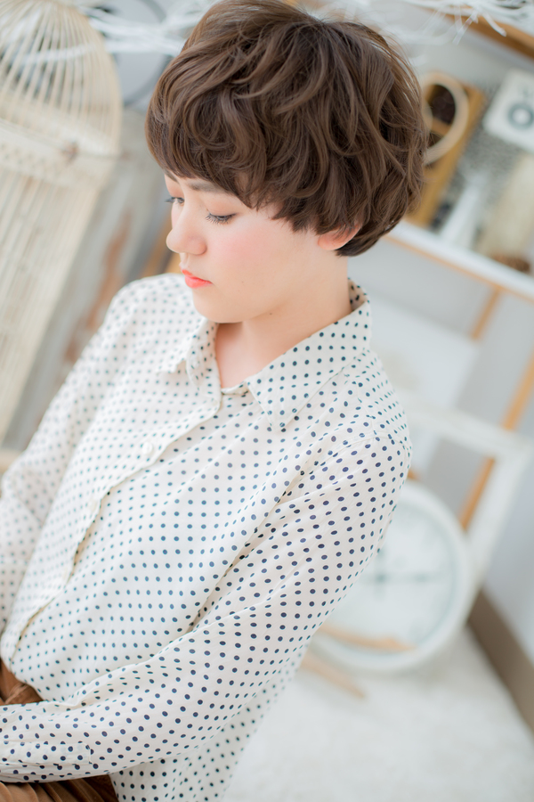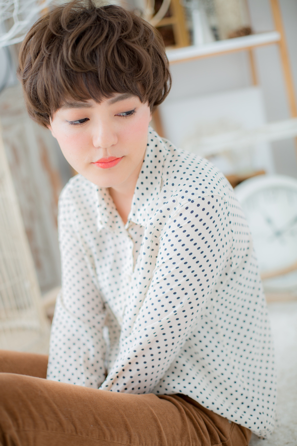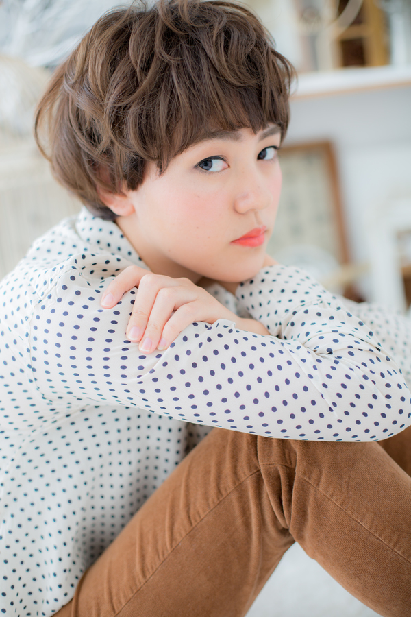 外国の子供のようなくしゃっとくせ毛風パーマでエアリーショートなヘアスタイルです。厚めバングと合わせて小顔見せ&目力UPで大人女子のコーデを完成!ラフショートは無造作なかきあげや斜めバングでフェミニンにしても大人かわいくヘアアレンジ!トリートメントしたようなカラーリングで髪の悩みも解決する人気のカラーやピンク系のカラーも◎30代・40代や面長の方にもおすす!(メイク担当:COVER HAIR GROUP成田)