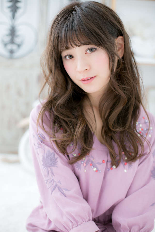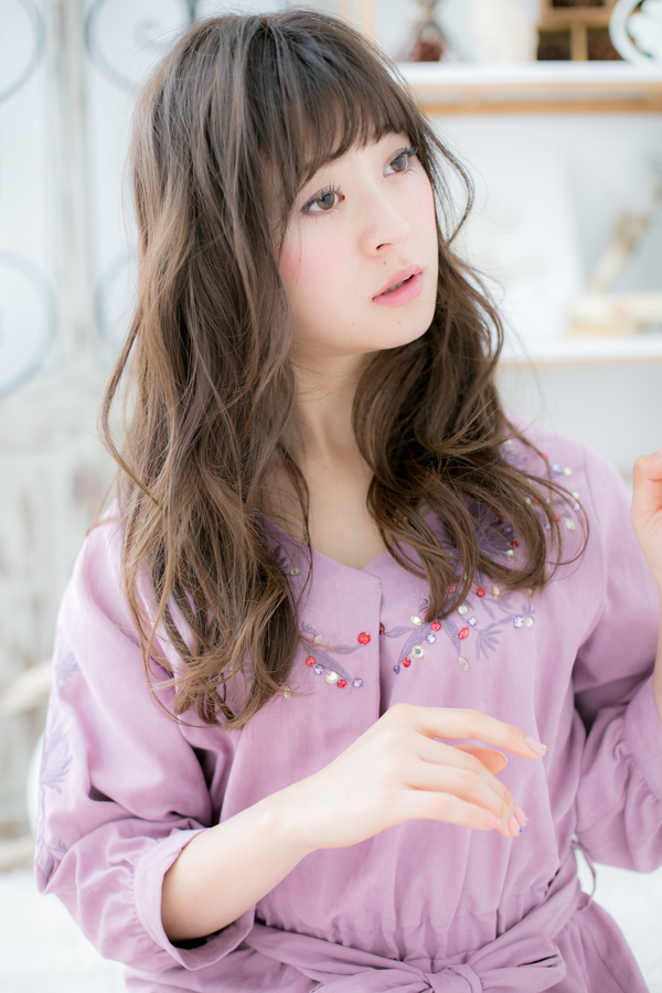 モテ要素満載ラブロングのヘアスタイル。斜めバングや厚めバングで目力UP、前下がりで小顔見せで大人女子のファションUP。ボリュームカールでグラマラスにしたり、くせ毛風カールで抜け感を出してヘアアレンジも◎耳かけも大人かわいい。トリートメントしたようなカラーリングで髪の毛の悩みも解決する人気のカラーもおすすめ!30代・40代や面長の方◎(メイク担当:COVER HAIR GROUP成田)
