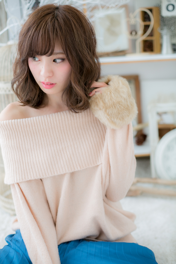目の上ギリギリの斜めバングで目力UPのヘアスタイル。サイドの前下がりラインで輪郭カバーして小顔にして大人女子のファション度UP。くせ毛風カールが大人かわいいふわミディは耳かけや厚めバングにヘアアレンジもgood。甘え顔に仕上げます♪ミディアムヘアを際立たせるグラデーションやトリートメントしたようなカラーリングもおすすめ!30代・40代や面長の方にも◎(メイク担当:COVER HAIR GROUP棟方)