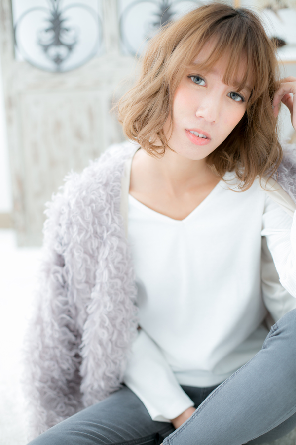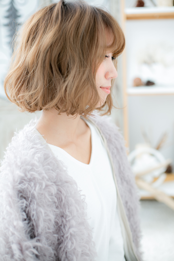ゆるふわくせ毛風カールがキュートなフェミニンボブのヘアスタイルです。斜めバングと合わせて大人女子のファション度UP!ナチュラルボブからのヘアアレンジにGOOD。耳かけや厚めバングも個性的でラブガーリーもGOOD☆ミディアムヘアを際立たせるグラデーションでトリートメントしたようなカラーリングで髪の悩みも解決する人気のカラーやピンク系もおすすめ!30代・40代にも◎(メイク担当:COVER HAIR GROUP棟方)