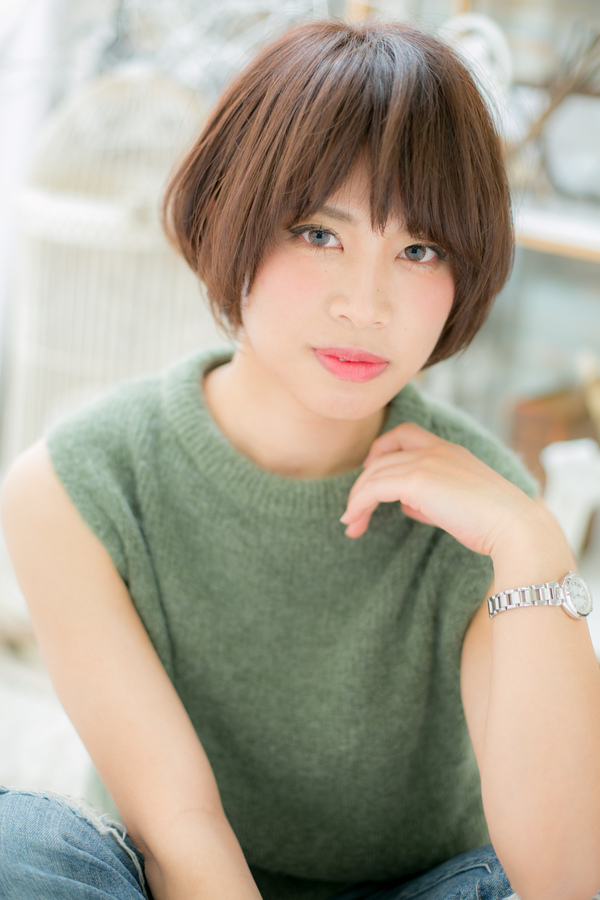 大人の女性だからこそ似合う丸みシルエットのショートのヘアスタイル!。耳かけしたサイドのシルエットと抜け感バングが大人の余裕を感じ大人女子のコーデを完成!。前下がりでスッキリ見せて小顔対策もバッチリ。トリートメントしたようなカラーリングで髪の毛の悩みも解決!人気のカラーやピンク系のカラーも◎30代・40にもおすすめ!(メイク担当:COVERHAIRGROUP 棟方)