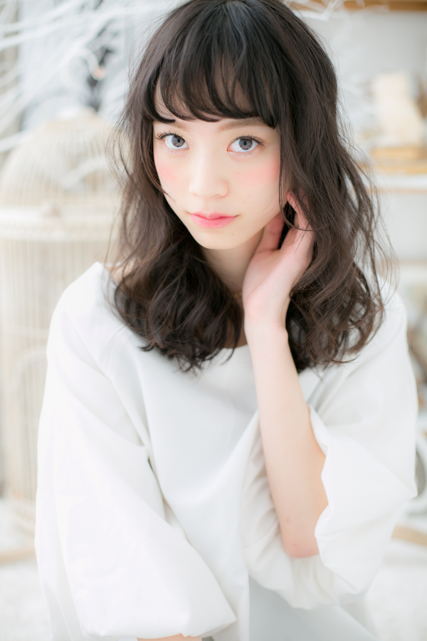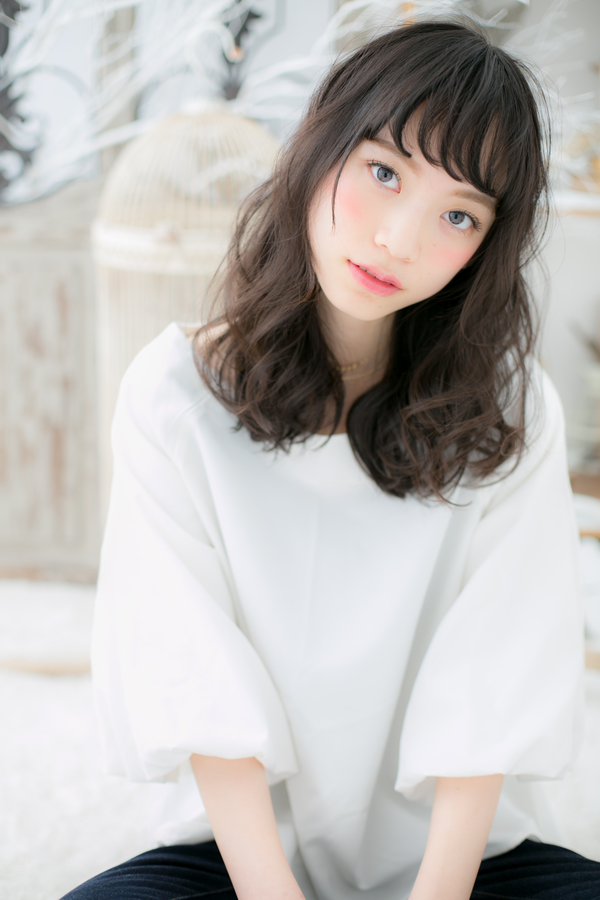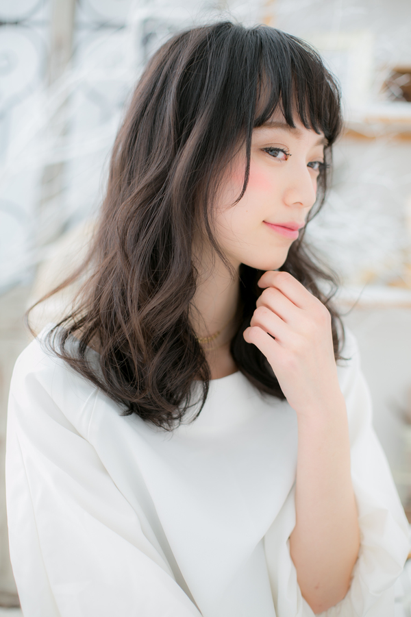厚めバングで目元を印象付けたふわミディのヘアスタイル。落ち着いた黒髪で大人かわいい雰囲気に。前下がりでクールにしたり、耳かけや斜めバングでガーリーにしてもOK。小顔効果もバッチリで大人女子のファション度UP。トリートメントしたようなカラーリングで髪の毛の悩みも解決!人気のカラーやピンク系のカラーもおすすめ!30代・40代にも◎(メイク担当:COVERHAIRGROUP成田)