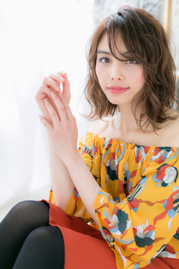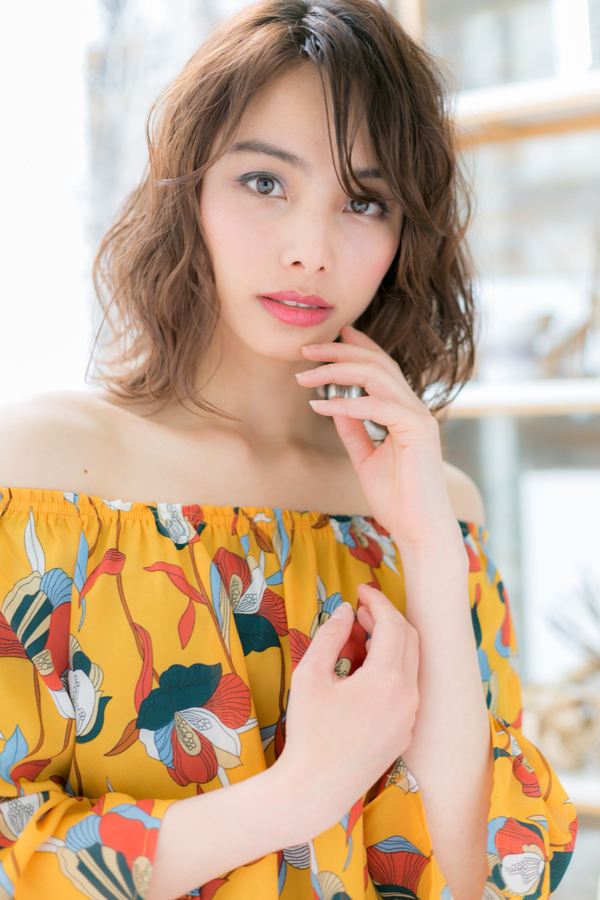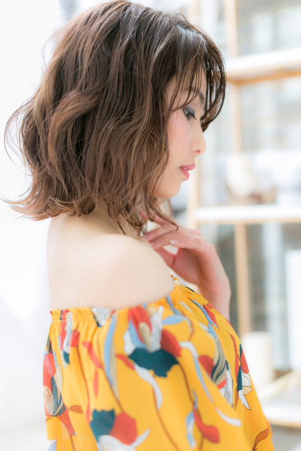 斜めバングのくせ毛風セミウェットミディ
