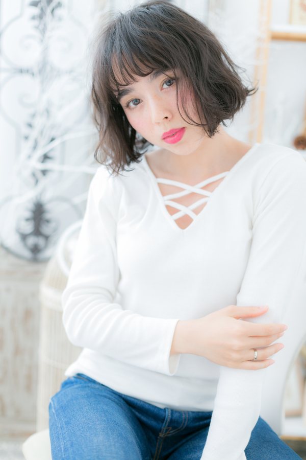 前下がりで小顔にメイクしているので、ボブ初挑戦の方にもオススメ。斜めバングや厚めバングで目力UPしたり、無造作質感の切りっぱなしボブもラブカジュアル。耳かけも大人かわいい。パーマで簡単スタイリングが嬉しい。ヒアルロン酸カラーは白髪にも対応可。
