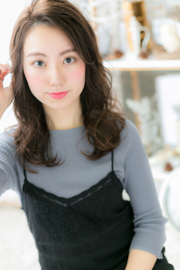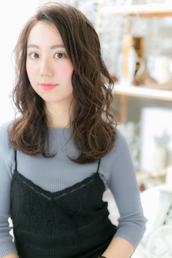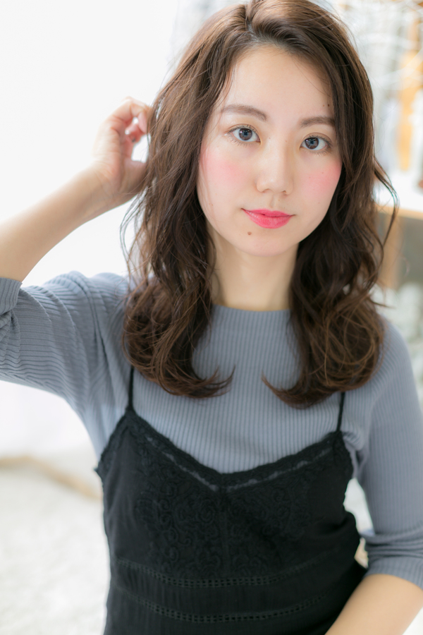 ミディアムレイヤーにパーマを。頬にかかる前髪で抜け感を出してくせ毛風ウェーブでやわらかさを演出して大人女子のコーデを完成。コテ巻きやデジタルパーマがオススメです。斜めバングや厚めバングで目力UPも◎トリートメントしたようなカラーリングで髪の毛の悩みも解決!カラーはアッシュグレー、ブリーチなしもおすすめ!30代・40代にも◎(メイク担当:COVERHAIRGROUP成田)