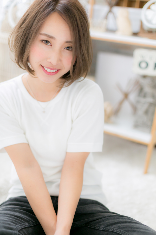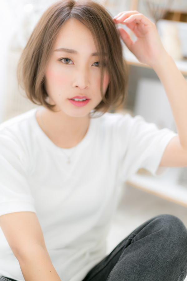 根元を立ち上げるようにドライ。無造作なかきあげが色っぽい。トリートメントバームかソフトワックスをもみこんで完成。前下がりで小顔にしたり、斜めバングや厚めバングで目力UPで美人顔。耳かけやセンターパートも◎ヒアルロン酸カラーは白髪にも対応可。