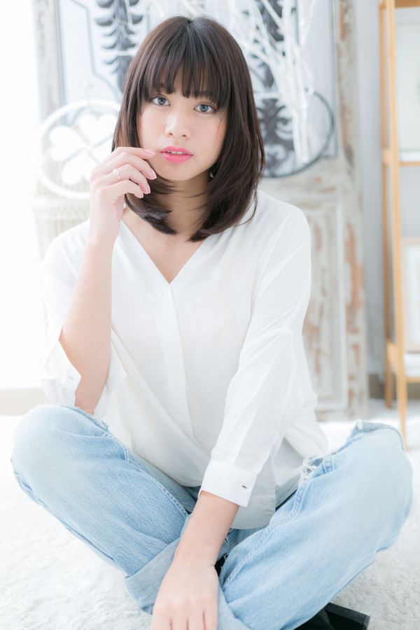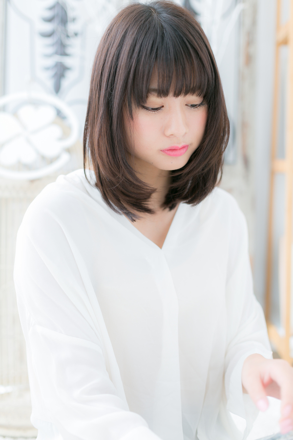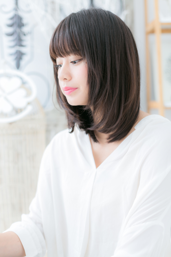 耳横のワンカールでボリュームを持たせた前下がりミディのヘアスタイル。サイドの毛流れで小顔に。斜めバングや厚めバングで目力UPしたりで大人女子のコーデを完成。くせ毛風ふわミディやワンレンも旬。ミディアムヘアを際だたせるグラデーションやベージュで髪の毛の悩みも解決!340代のエラ張り対策におすすめ!(メイク担当:COVERHAIRGROUP棟方)