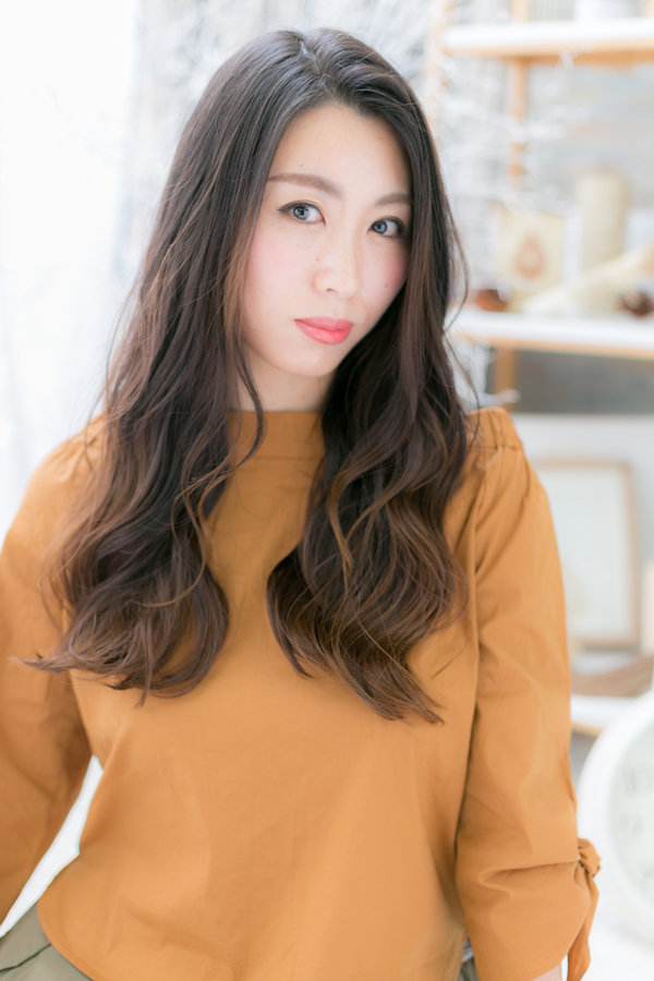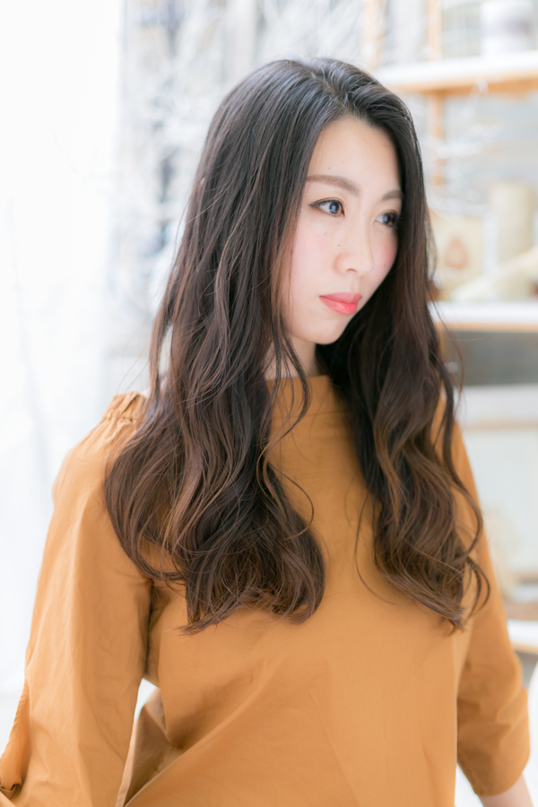 肩下で揺らめく外国人風カールがグラマラス。セクシーなかきあげやセンターパートで大人女子のコーデを完成。前下がりで小顔に見せたり、耳かけも大人かわいい。髪の色は暗めのグラデーションやベージュもおすすめ!40代にも人気!(メイク担当:上尾店 中田)