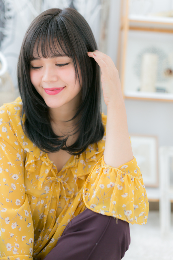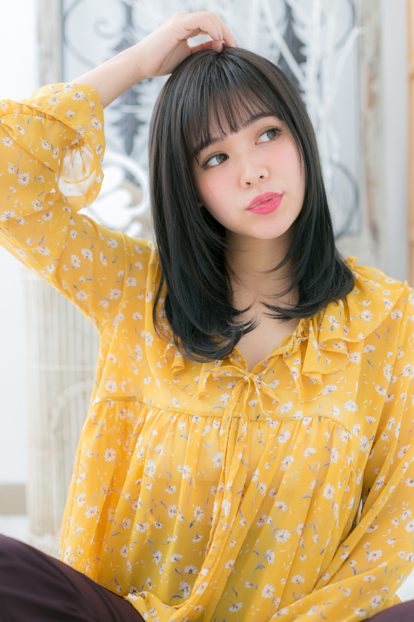 うっとりするほどの透明感★黒髪ワンカールストレート。上品セミディで周囲と差をつけて。斜めバングや厚めバングで目元を印象つけたりで大人女子のコーデお完成。髪の毛の悩みを解決する人気カラーもおすすめ!30代・40代にも◎