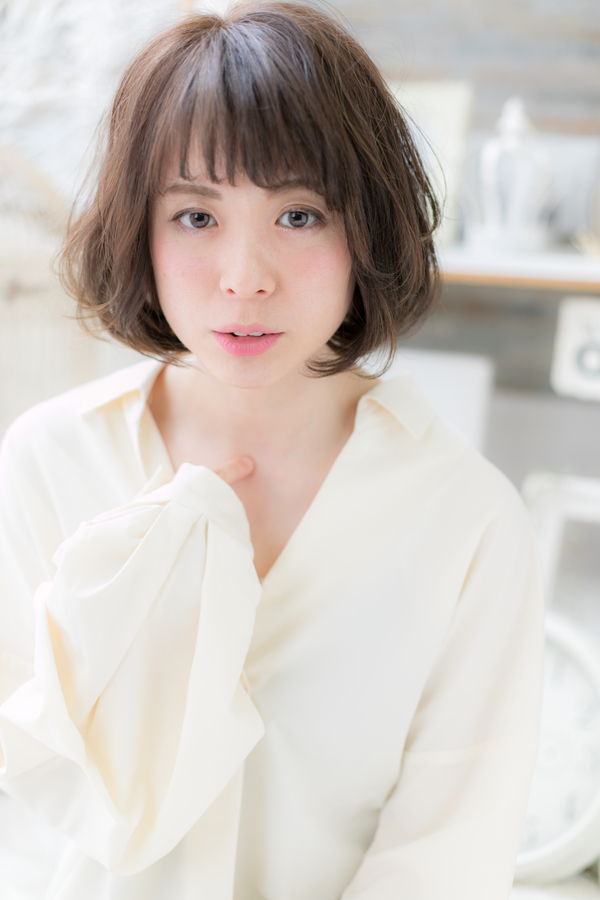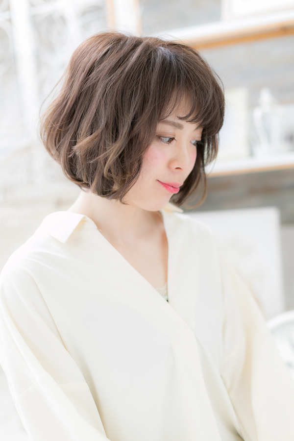 ひし形シルエットのボブに計算されたCカールとSカールをプラスしたへアルタイル。デジタルパーマで再現性UP。斜めバングや厚めバングで目力強調で大人女子のファッション度UP。トリートメントしたようなカラーリングで髪の毛の悩みも解決!人気のカラーやアッシュ系のカラーもおすすめ!40代のエラ張り対策にも◎(メイク担当:COVERHAIRGROUP棟方)