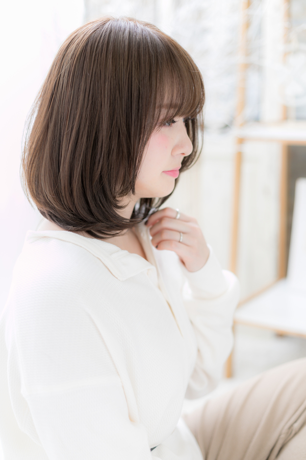 斜めバングや厚めバングで目力強調したり,前下がりで小顔にしても大人かわいい/耳かけやくせ毛風ふわミディも旬の髪型/ナチュラルボブや大人ボブ,フェミニンボブや前下がりボブからの伸ばしかけに◎ヒアルロン酸カラーは白髪にも対応可/20代/30代/40代