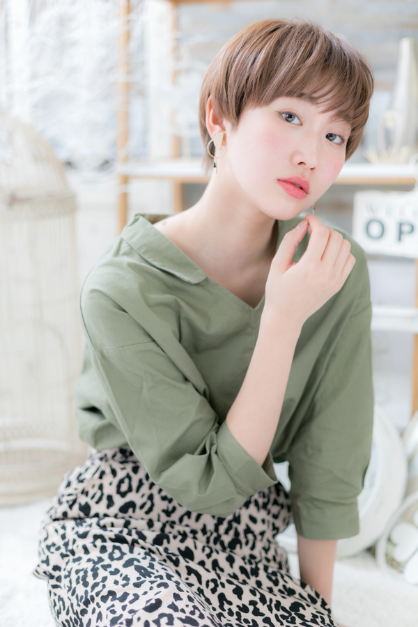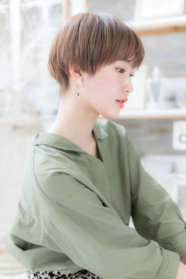 シンプルなナチュラルマッシュはツヤ感溢れるベージュカラーで外国人風に格上げ。目の上ギリギリの斜めバングや厚めバングで目力強調で大人女子のファッション度UP。ショートは前髪ありも前髪なしもGOOD。トリートメントしたようなカラーリングで髪の毛の悩みも解決!人気のカラーもおすすめ!(メイク担当:COVERHAIRGROUP棟方)