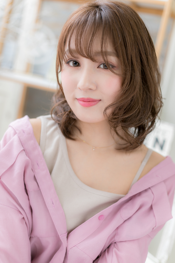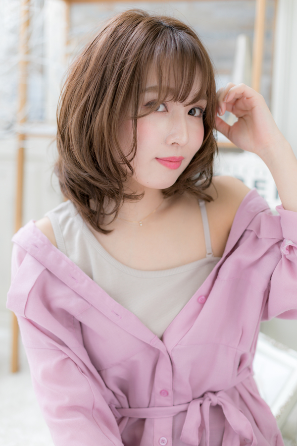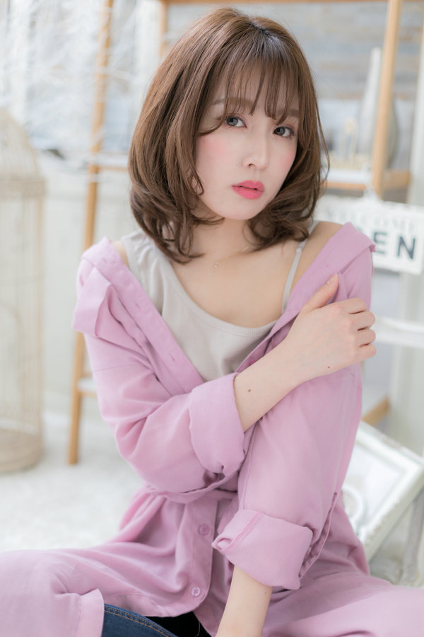 シースルーバングでトレンド感UPのくせ毛風ふわミディ。前下がりで小顔や耳かけでアシンメトリーなヘアアレンジで大人女子のファッション度UP。ミディアムヘアを際立たせるグラデーションやベージュの暗めの髪の色もおすすめ!30代・40代にも◎(メイク担当:COVERHAIRGROUP成田)
