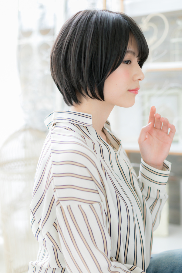 ナチュラルストレートの王道ひし形ショートのヘアスタイル。朝の時短が嬉しい簡単スタイリング。前下がりで小顔見せ効果でヘアアレンジ◎斜めバングや厚めバングで目元を印象付けたり耳かけも大人女子のコーデを完成。ショートは前髪ありも前髪なしもどちらでもOK。30代・40代にもおすすめ!