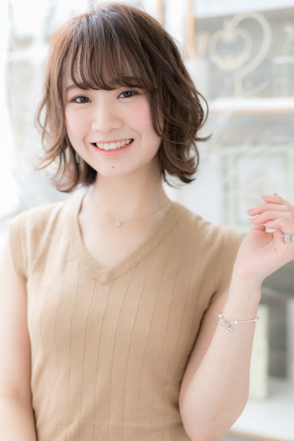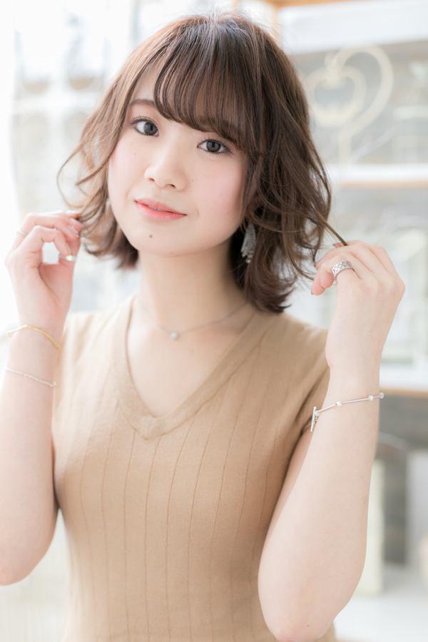 ボブベースですがトップに軽さを出すことで軽やかさの出る髪型に。くせ毛風ウェーブで凸を作ることにより小顔見せ効果◎斜めバングや厚めバングで目力UPしたり、耳かけも大人かわいい。前下がりのふわミディも美人顔。