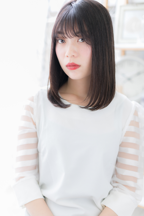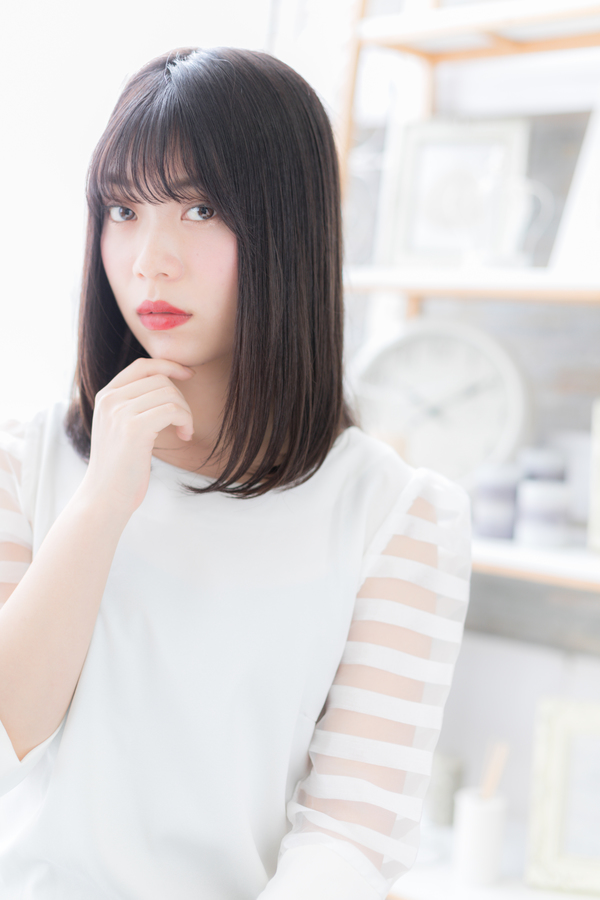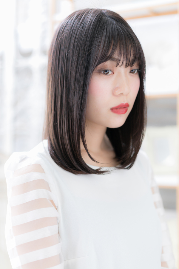 乾かすだけでナチュラルにおさまる黒髪ヘアスタイル。シースルーバングで透け感を出して、重めスタイルの中に軽さと動きを演出して大人女子のコーデを完成。斜めバングや厚めバングで目力UPしたり、くせ毛風無造作パーマのふわミディやくびれミディにヘアアレンジOK。40代のエラ張り対策にもおすすめ!