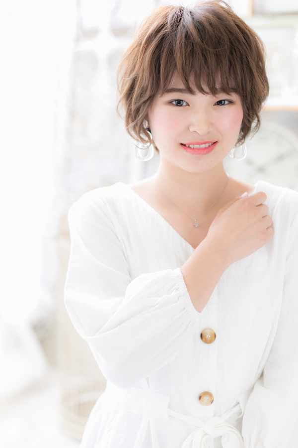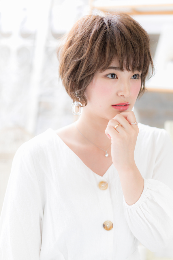 すき間あるシースルーバングで小顔見せ。ラフなくせ毛風ショートでエアリーな雰囲気で大人女子のコーデを完成。幅広い年代の方に似合うヘアスタイルです。トリートメントしたようなカラーリングで髪の毛の悩みも解決!人気のカラーや思い通りの茶色カラーもおすすめ!(メイク担当:COVERHAIRGROUP岩淵)