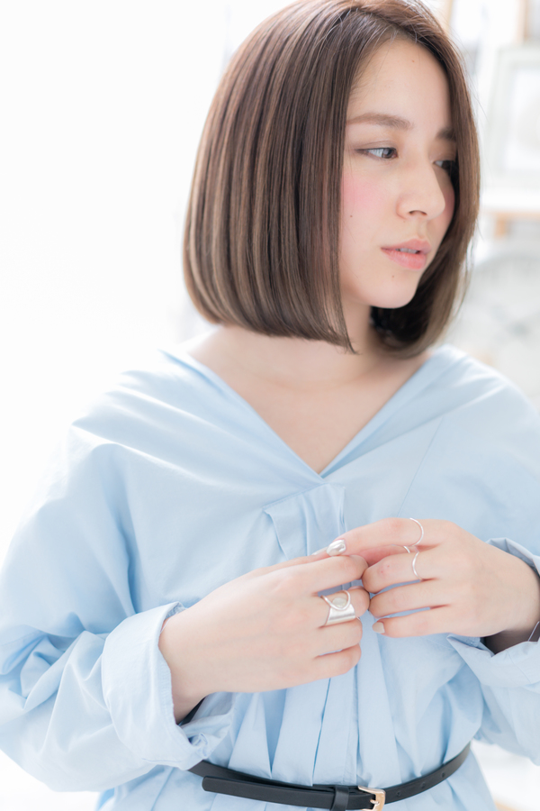 ツヤと透明感溢れるワンレンナチュラルボブのヘアスタイル。前下がりで小顔見せ効果。耳かけしたり、斜めバングや厚めバングで目力UPしてもGOOD。くせ毛風ふわミディやくびれセミディも大人かわいい。ミディアムヘアを際立たせるグラデーションやベージュの暗めの髪の色もおすすめ!40代にも人気の髪型です。(メイク担当:COVERHAIRGROUP成田)