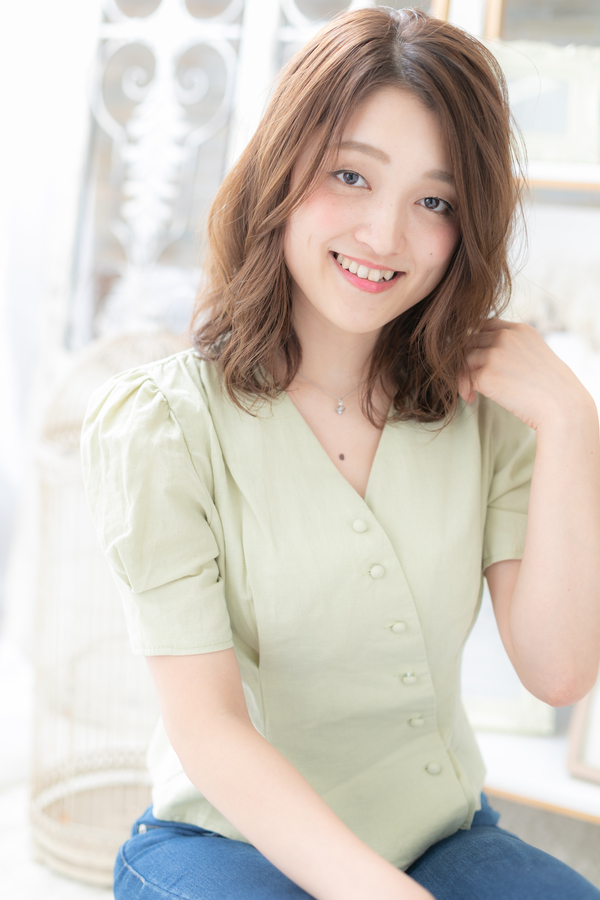 ミディアムボヘアを際立たせるためのグラデーションやベージュの暗めの髪の色で小顔見せ効果のある巻きスタイルでヘアアレンジ。どんなファッションにも合わせやすい髪型で大人女子のコーデも完成。斜めバングや厚めバングで目力強調。耳かけや前下がりも大人かわいい。40代のエラ張り対策にもおすすめ!(メイク担当:上尾店 磯田)