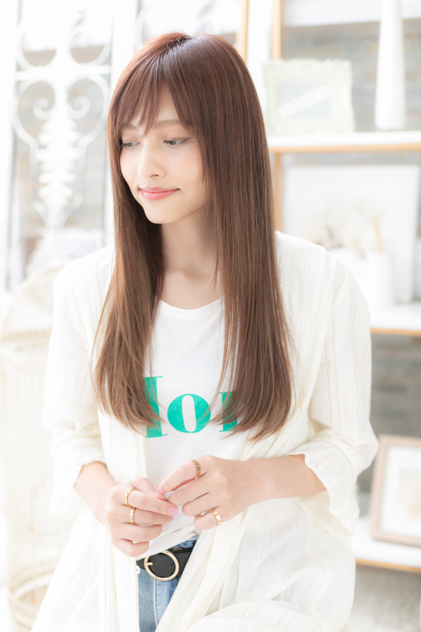 うるっとした魅惑的ロングは斜めバングや厚めバングで目力UPで大人女子のコーデを完成。流れつらい方はパーマで朝ラクなヘアスタイルに。ストレートを保つ為,縮毛矯正やフォルムストレートがオススメ。トリートねメントしたようなカラーリングで髪の毛の悩みも解決。人気のカラーやグラーデジョンやベージュの暗めの髪の色も◎(メイク担当:COVERHAIRGROUP成田)