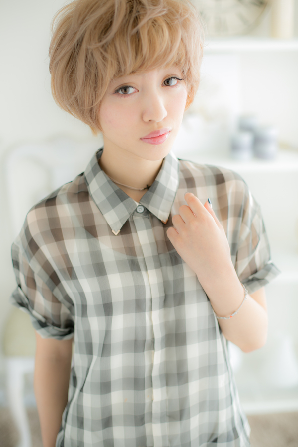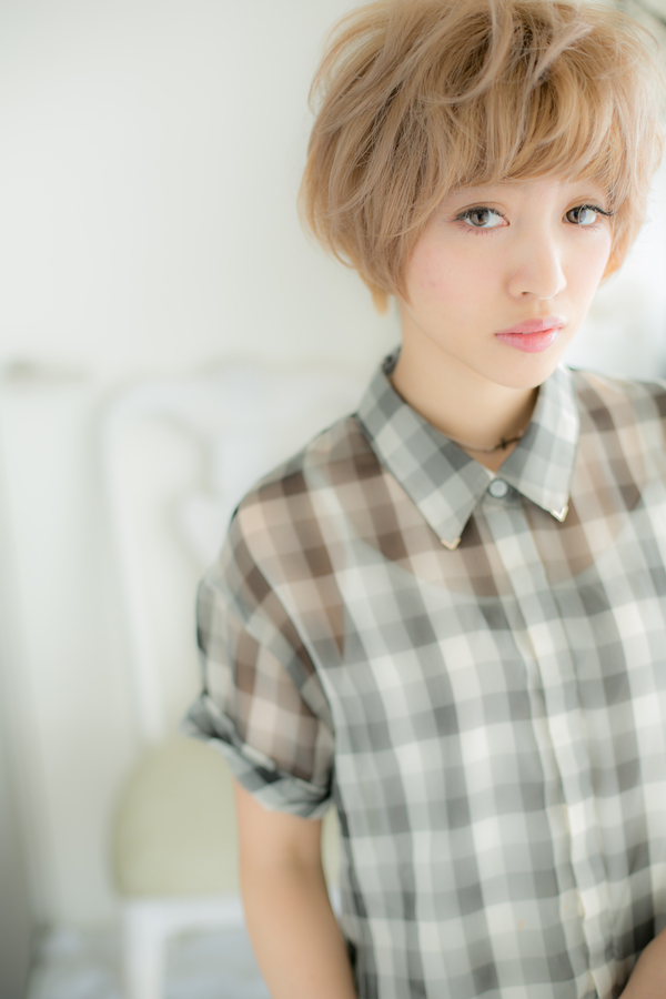 ふんわりしたカールがとってもガーリーなショートスタイル。ハイトーンカラーが,髪を柔らかく見せ,スィートに。ゆるーいカールなので無造作なくせ毛風に簡単スタイリングでOK!伸ばしかけやストレートに飽きた方もオススメです。斜めバングで大人かわいくも☆