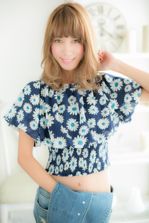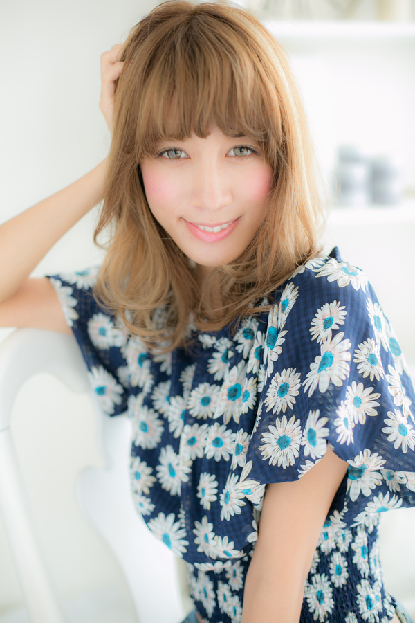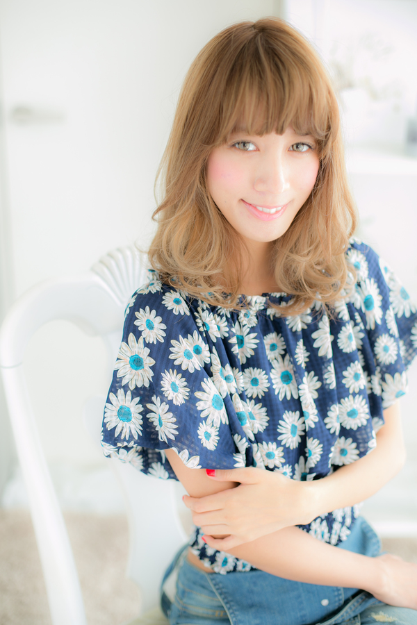 鎖骨ラインで弾むラフなカールが、ナチュラルでガーリーな雰囲気を醸し出してくれます♪少しパーマをかけた厚めバングで簡単スタイリング。ハイライトを入れてカジュアルさを。センターパート、斜めバングや、大人かわいいスタイルもご相談ください