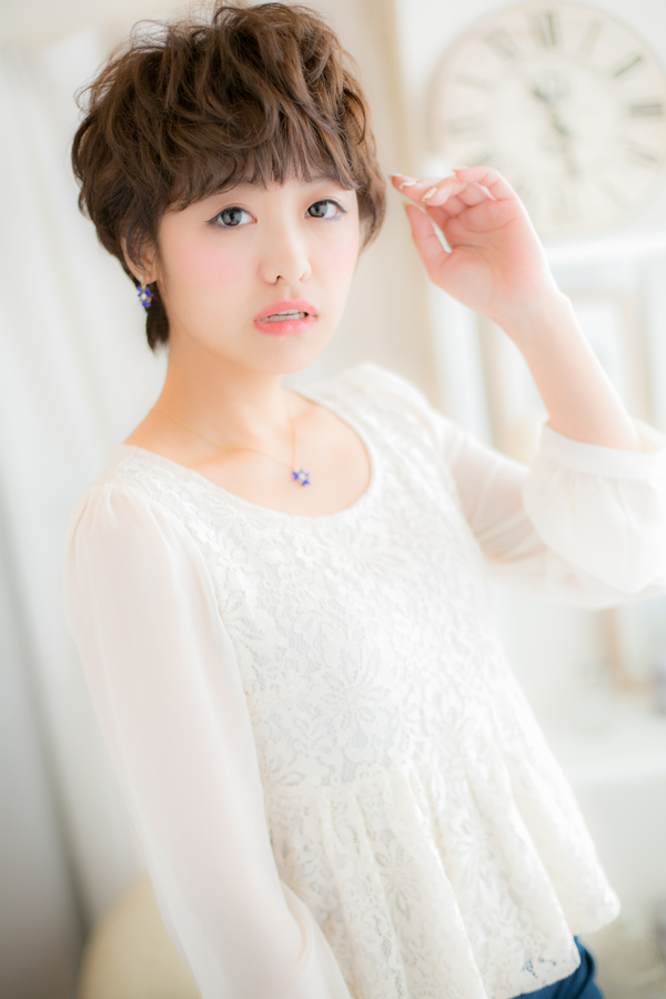 根元から無造作にふんわりカールをかけて,大人グラムなフェアリーショートスタイルに♪カラーも明るめが空気感がでてGOOD!小顔を狙うなら,ネオウルフベースにすると◎もっとクセ毛風に柔かいカールならフェミニン感もUP!簡単スタイリングでスタイルキープ!