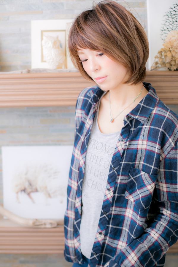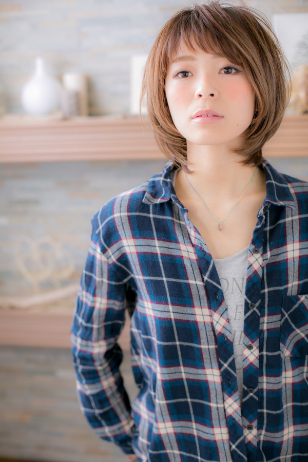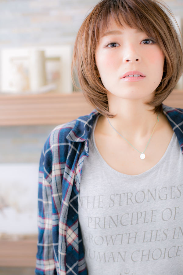 ラフなナチュラルボブに短めバングで作りこみすぎないおしゃれ感もプラス。明るめカラーで透明感のあるつや色にするのがおすすめ。無造作にかき上げた流れが大人っぽい雰囲気もつくるのでどんな服装にもマッチ。
