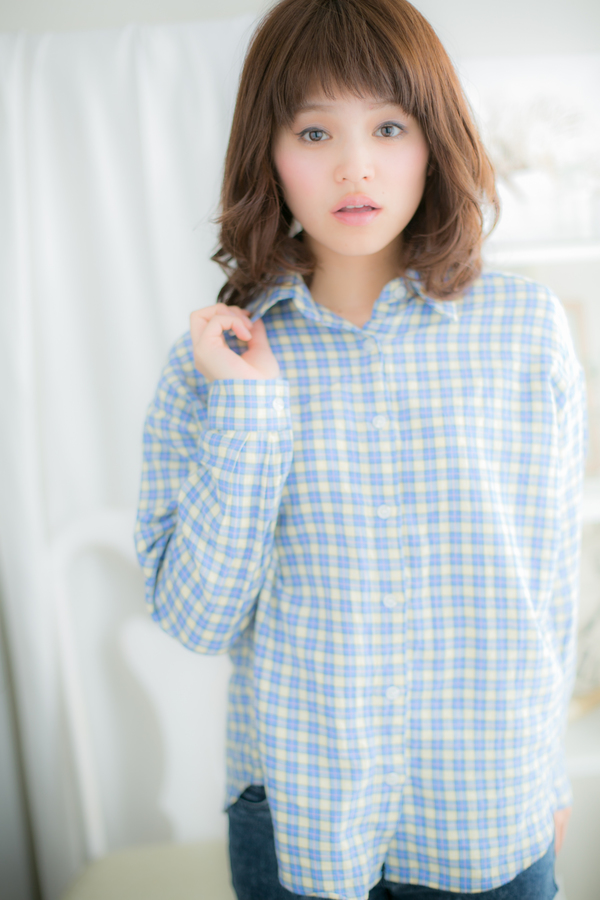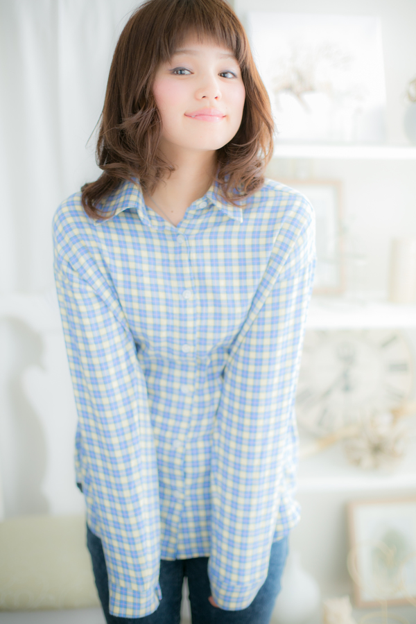 計算ずくの短めのラウンドバングにパーマをプラスしたふわミディがガーリーなおしゃれ感を☆伸ばしかけの方には断然カールがおすすめ☆レイヤーをあまりいれず,ふわミディにしても大人かわいい。耳かけしても◎カジュアルな抜け感スタイルを1度試して♪