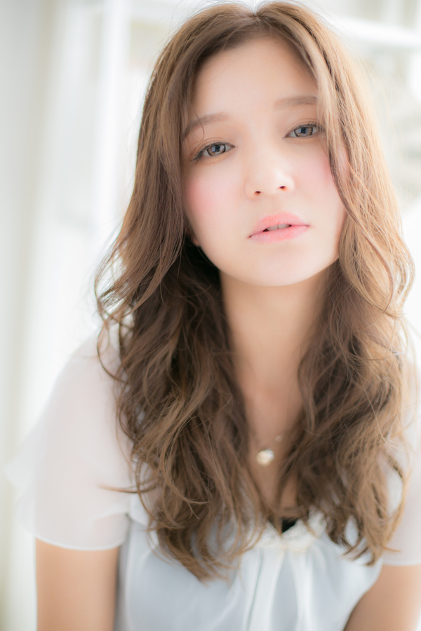 ノーバングで顔周りをスッキリ見せ、明るく華やかに。さらにあごラインからのランダムカールで表情に優しさと柔らかさをプラス。フェミニン度・モテ度満点の抜け感あるロングスタイルです。