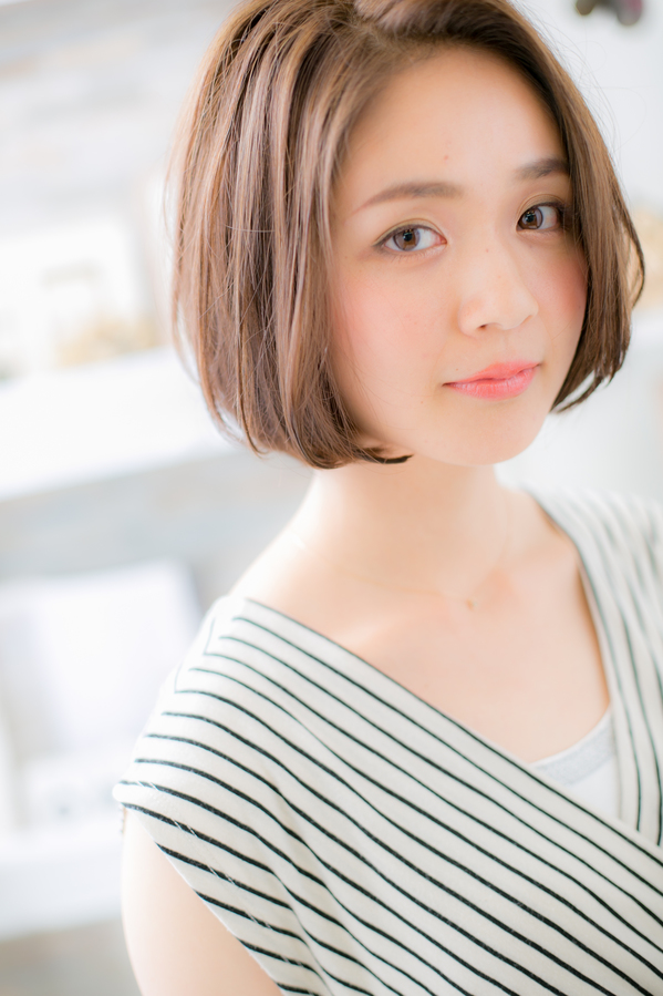 大人カワイイショートボブ。前下がりベースになっているので、小顔効果もUP!カラーはトップにハイライトが入っているので、重めのボブでも動きやすさが出てオススメです。