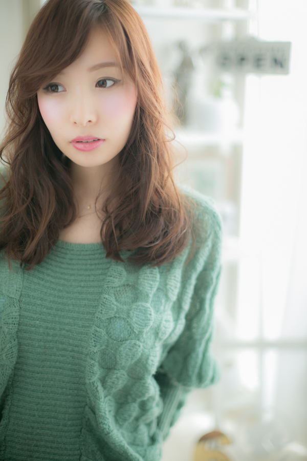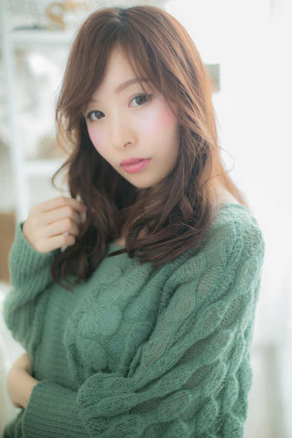 重めシルエットに、ブラウン系の明るめカラーと作りこまないラフなカールをオン。甘辛バランスのとれたフェミニンでリラクシーなモテロングに♪目の上ギリギリの流し前髪と、フリルのように織りなすカールは、触れたくなるような極ふわ感です☆