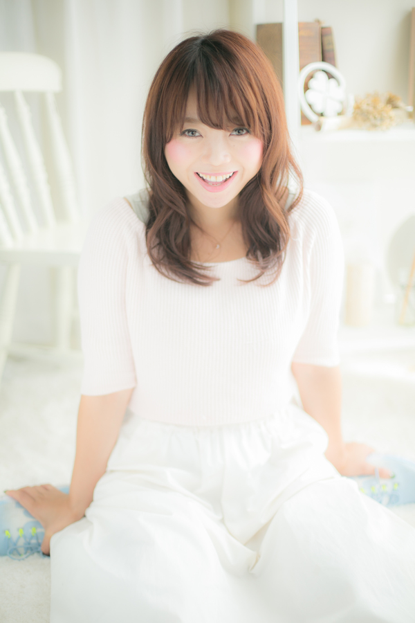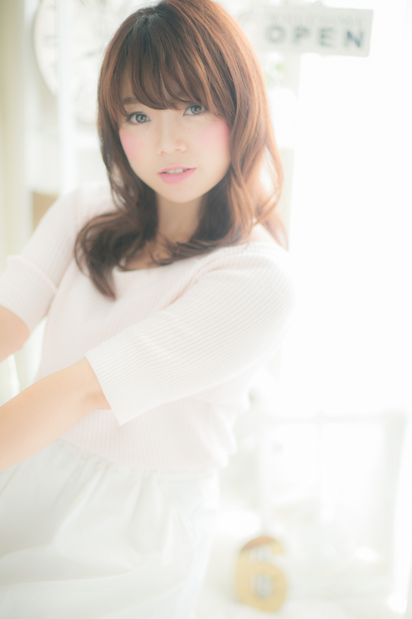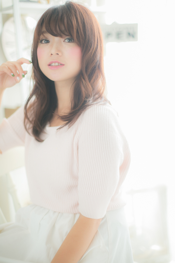 コテでコロンと巻いたような大きめのカールがピュアな女性らしさをだして大人っぽくかわいいミディスタイルに。目の上ギリギリの厚めバングで小顔にみえるのもポイント☆