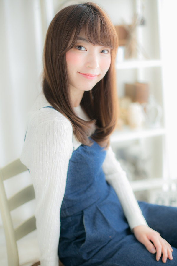 柔らかい内巻きカールと流し前髪が女性らしさをグンとアップさせます!柔らかいベージュ系カラーでフェミニンさもぐっとアップ☆