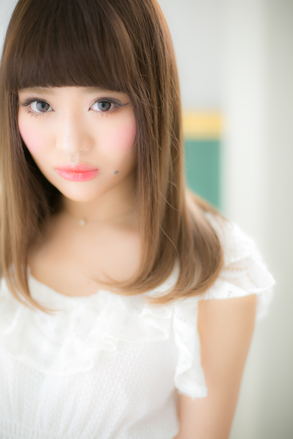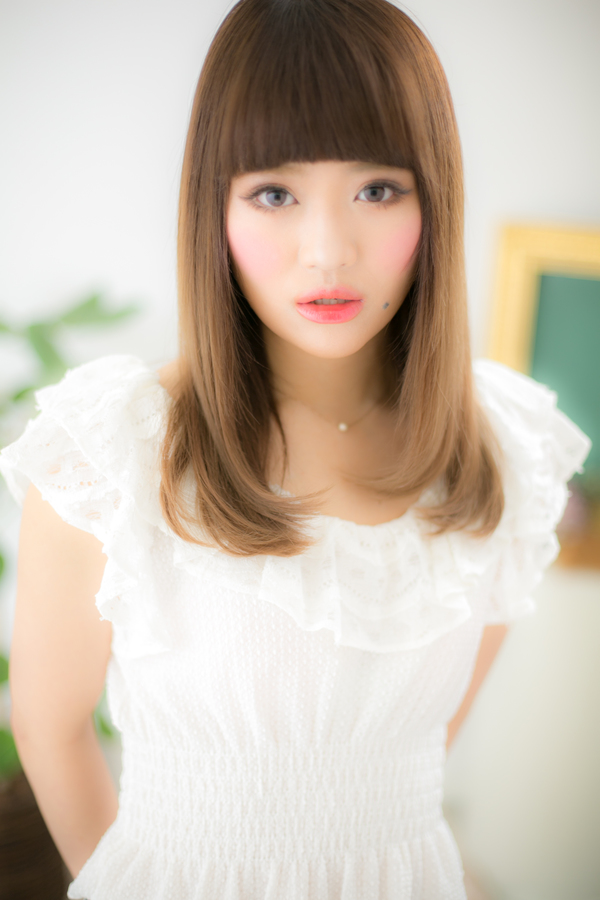 ぱっつん厚めバングがドーリーっぽく可愛い,でも明るめのカラーで個性的すぎずいつものストレートスタイルが一気にオシャレ度UP!!自然な内巻のカールも手間いらず!ノーブルカラー,マーメイドアッシュ,グラデーションカラー,ヌーディカラーもオススメ♪
