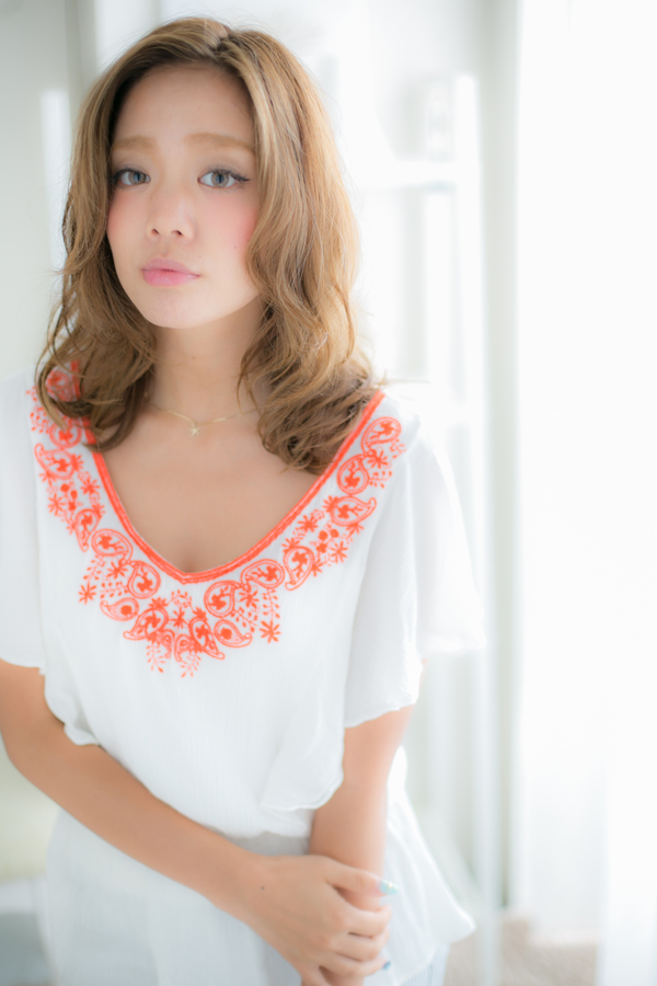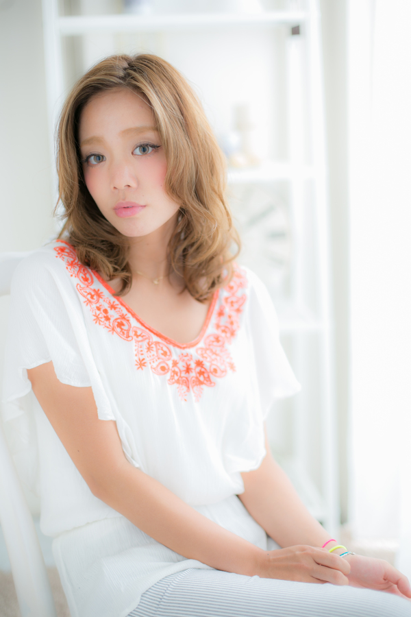 ふんわり,空気感のあるウェーブと透きとおるツヤカラーが抜け感ある魅力的なふわミディスタイル。ナチュラルな質感のオシャレ上級者ウェーブ。柔かいボリュームがスタリングの幅を広げます!かきあげバング,斜めバングやセンターパート,色々試して♪