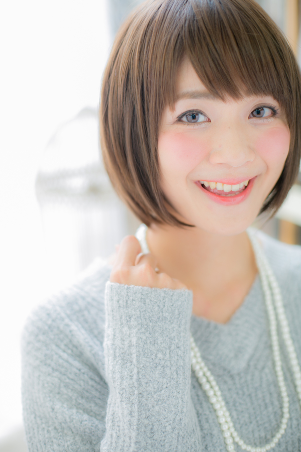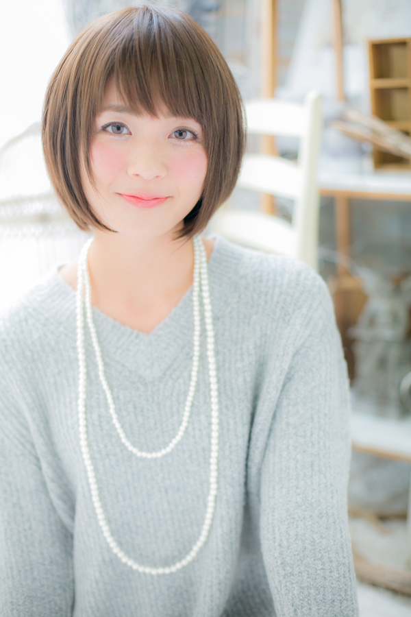 顔周りを包み込むようなショートスタイル。前髪は目のラインでカットして目力UP。ボリュームが出やすい方はストレートパーマがオススメです。
