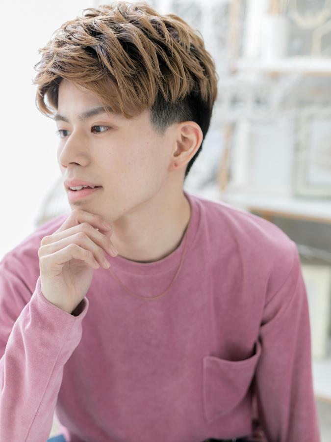 パッと目を引くハイトーンと立ち上げが男らしいワイルドアップバング。くせ毛風カールでニュアンス感ある動きをつけたり、強めパーマで攻めてもOK!耳上の刈り上げで毛量調整をして、トップにボリュームをだしてもおすすめ。30代・40代にもお勧め髪型。(メイク担当:COVERHAIRGROUP成田)