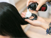 ②前処理は念入りに2回行います。フォーム状のトリートメントで、髪全体を修復し、これから行う施術のダメージの進行を防止します。カラーの発色が良くなったり、パーマの持ちがよくなったりします。