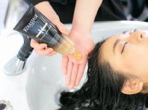 ②バン クロノロジストでクレンジングを行い、シャンプー剤の中に保湿効果の高い成分が含まれているので、2~3分おいてから洗い流します。