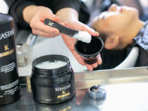 ③クロノマスクとキャビアを調合し、贅沢なトリートメントを完成後、頭皮と髪に塗布し、スカルプマッサージを行います。