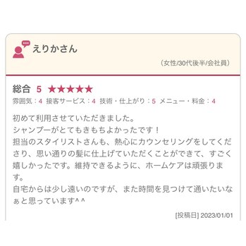 皆様から頂いたお言葉を元に、技術や接客を向上出来るように課題を教えていただき、とても勉強させて頂いております。