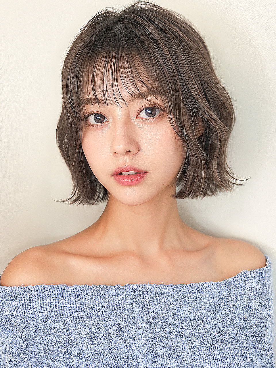 波巻き,韓国風,ワンレンボブ,くせ毛ショートウルフ,大人ボブ,厚めバング,かきあげ前髪,チャコールグレー,ナチュラルボブ,ボブショート,アシンメトリー,センターパート,簡単スタイリング,モテ,髪型,ヒアルロン酸ブラウンカラーは白髪にも対応