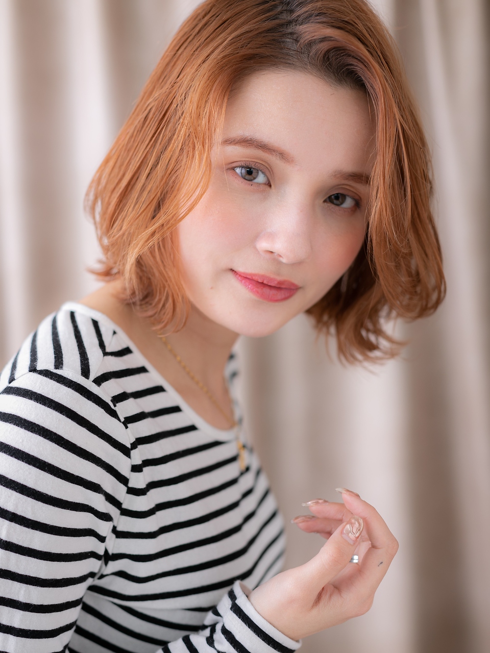 寝起きみたいなゆるふわ感が大人かわいい、ラフ&カジュアルなくせ毛風フェミニンボブ。斜めバングで目元を強調&前下がりで小顔見せ。切りっぱなしボブからイメチェンしたい方にオススメの大人ボブです。耳かけも◎