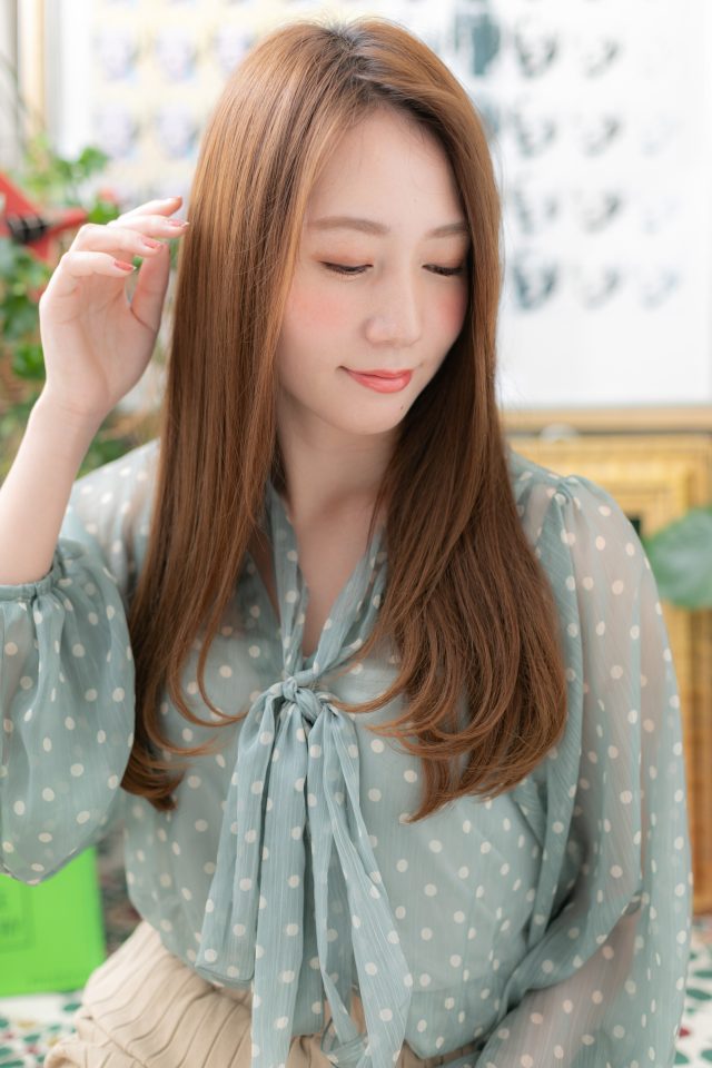 重めスタイルになりがちなストレートロングは、トリートメントしたようなカラーリングで髪の毛の悩み解決。人気のカラーやツヤ感ブラウンベージュカラーで。アシンメトリーに仕上げたかきあげバングでこなれ感を出して大人女子のコーデを完成。(メイク担当:川口店成田)