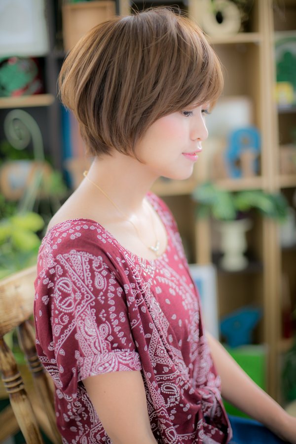 シンプルで清潔感あるナチュラルなボブ。小顔にも見える斜めバングと明るいツヤ色カラーで可愛くもフェミニンにも♪ナチュ可愛いスタイルは男女問わず人気です。