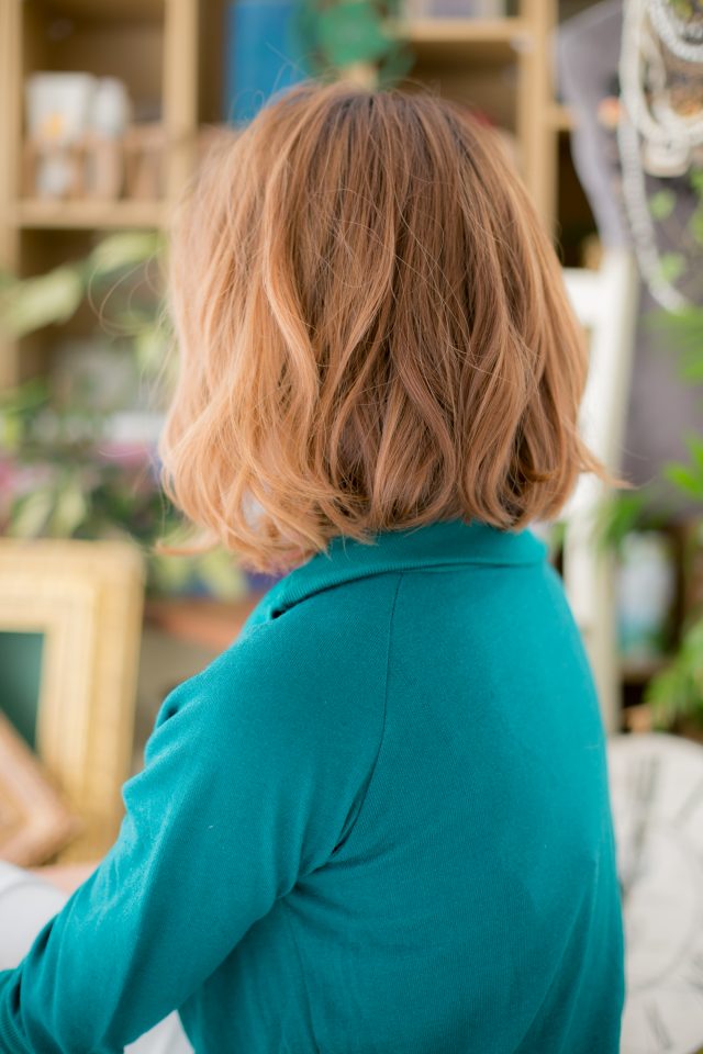 小顔効果ある前下がりボブに、くせ毛風のニュアンスカールをオン。空気感ある動きでアンニュイ顔に。グラデーションカラーでスパイスを加えて色っぽさをプラス。耳かけも大人かわいい。(メイク担当:北浦和店 近藤)