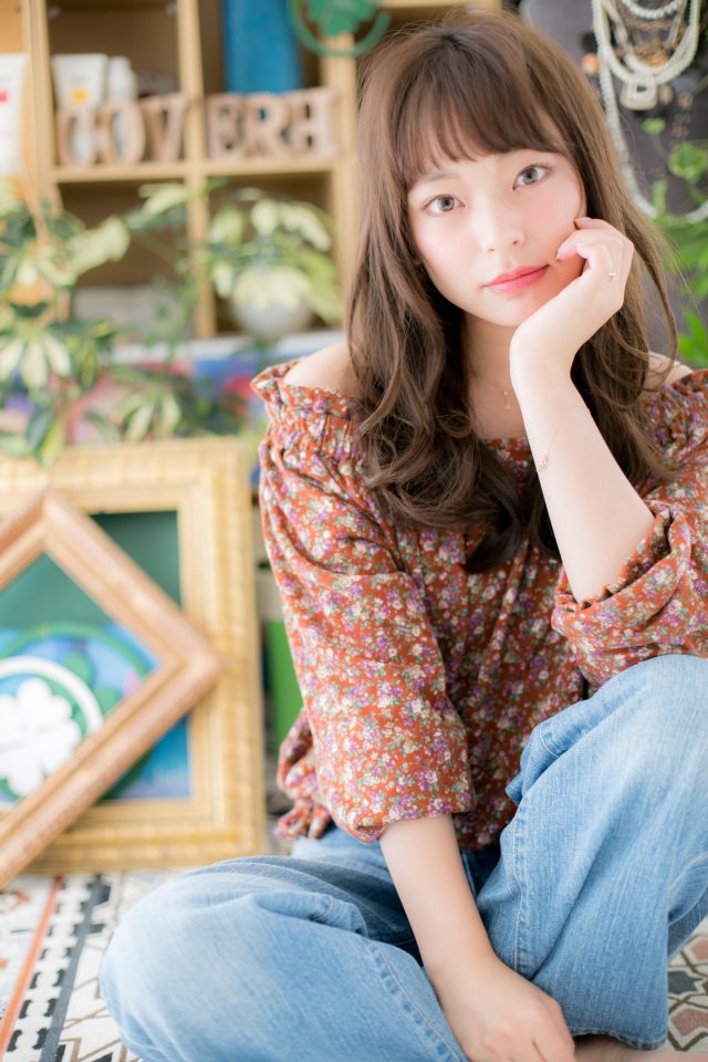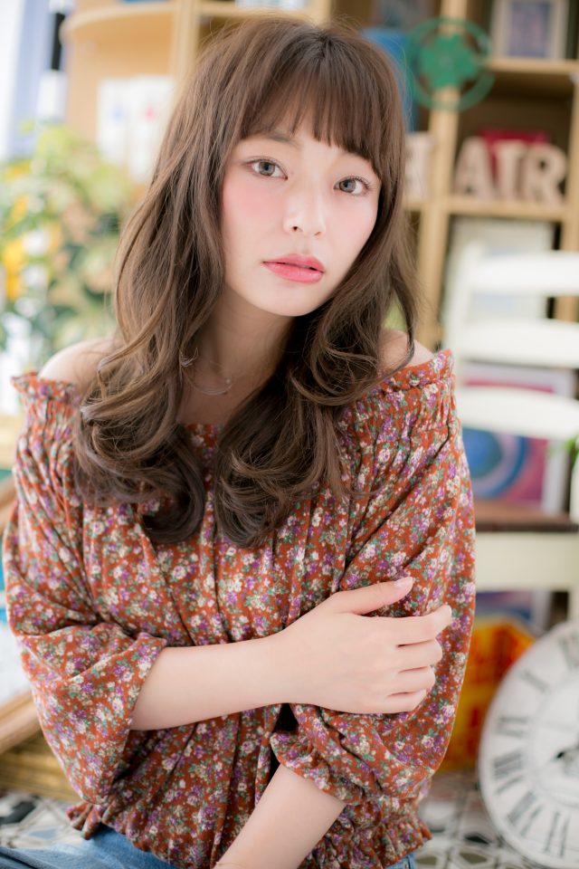 目元に印象を残す斜バングや厚めバングが大人かわいい♪愛されラブロング。くせ毛風カールと耳かけでガーリーにしたり、ワンサイドで抜け感を出してもOK。前下がりラインで小顔メイク♪(メイク担当:北浦和店 棟方)